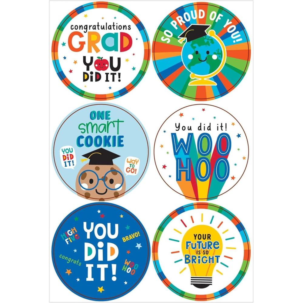 “Graduation Fun Stickers include colorful and playful designs full of smiling characters and congratulatory messages. They're perfect for distributing to a graduating class or decorating a page in your little one's scrapbook.