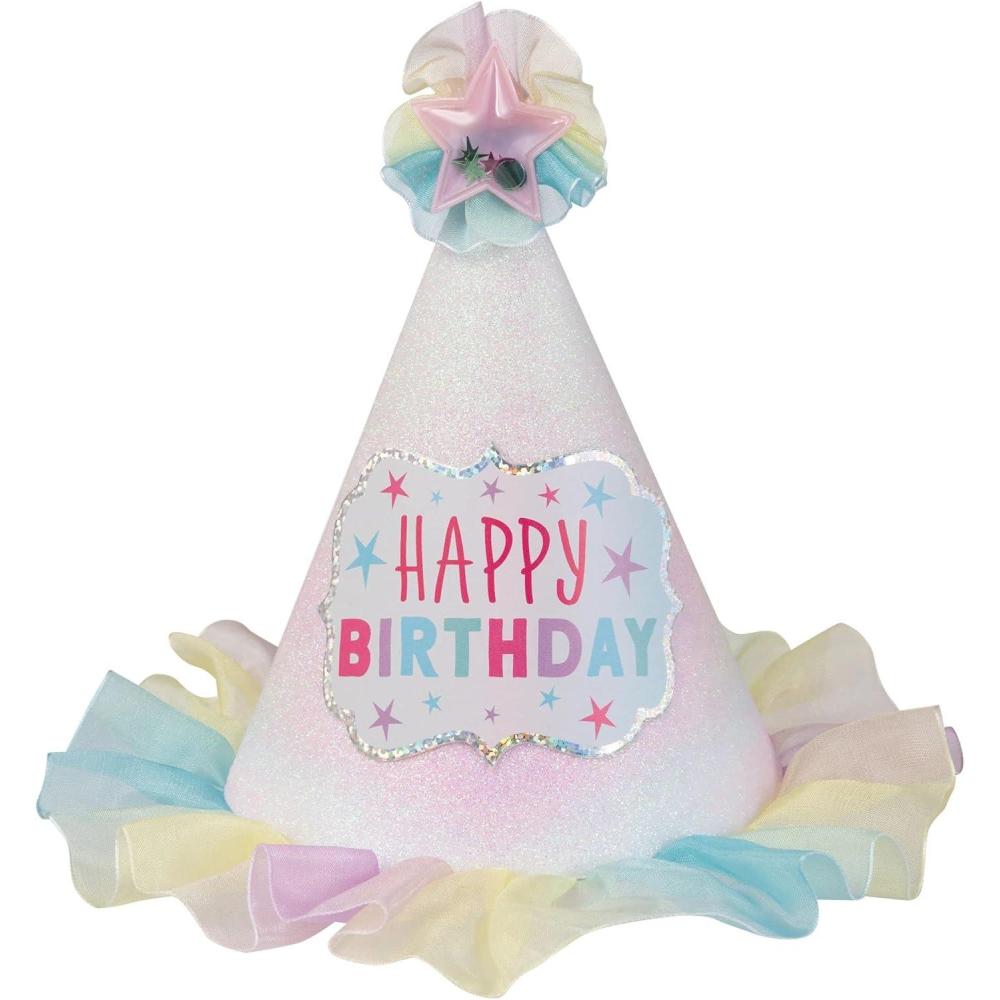 SHIMMERING DESIGN: This cone hat features a glittery iridescent print, a multicolored pastel fabric and a “Happy Birthday” headline.