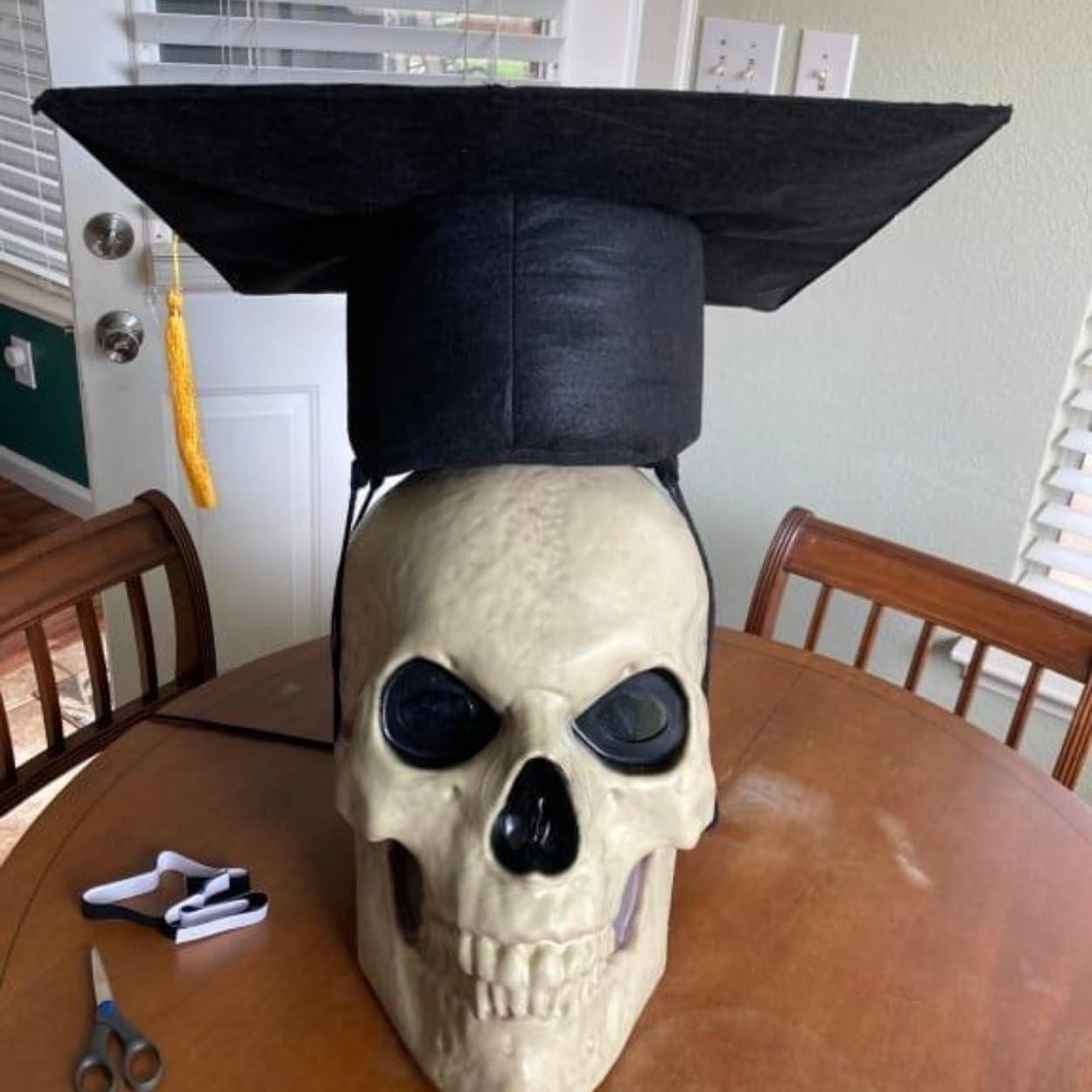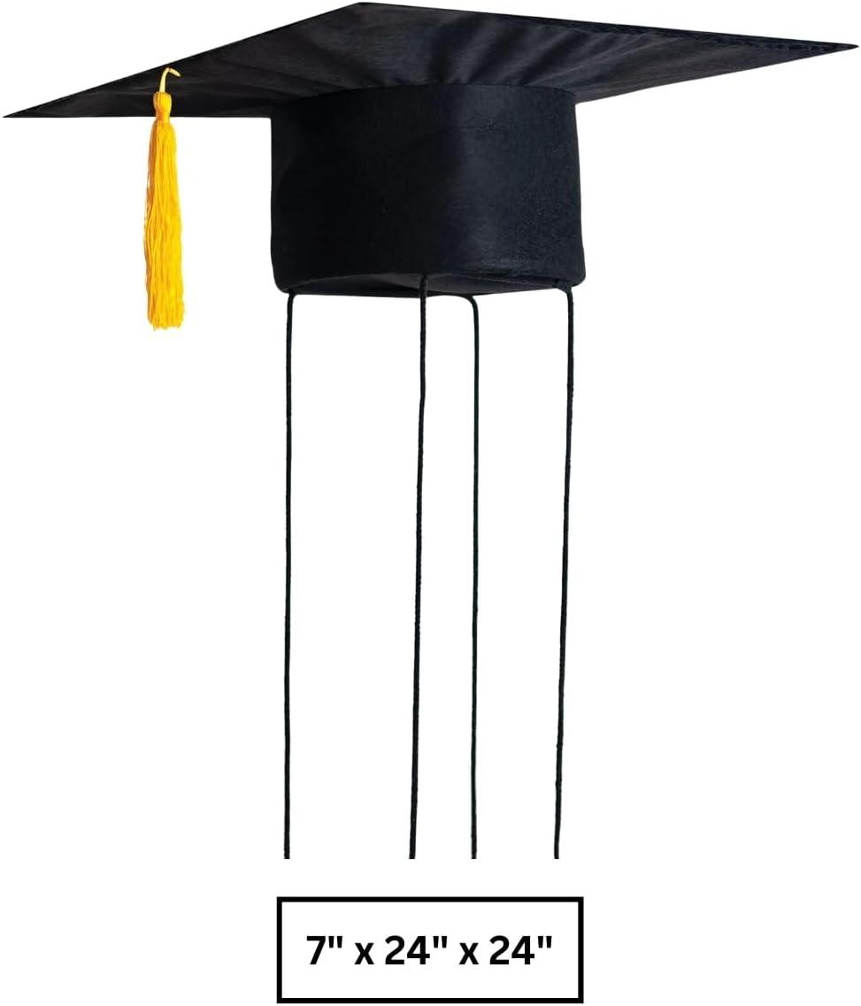 Dress your car up for the grad celebration with a giant grad cap! This oversized fabric mortarboard hat is black with a gold tassel. To use, place on your car's roof. Run each rope through the windows and tie tightly together inside your car, then close the windows. Now it's ready for the big day!