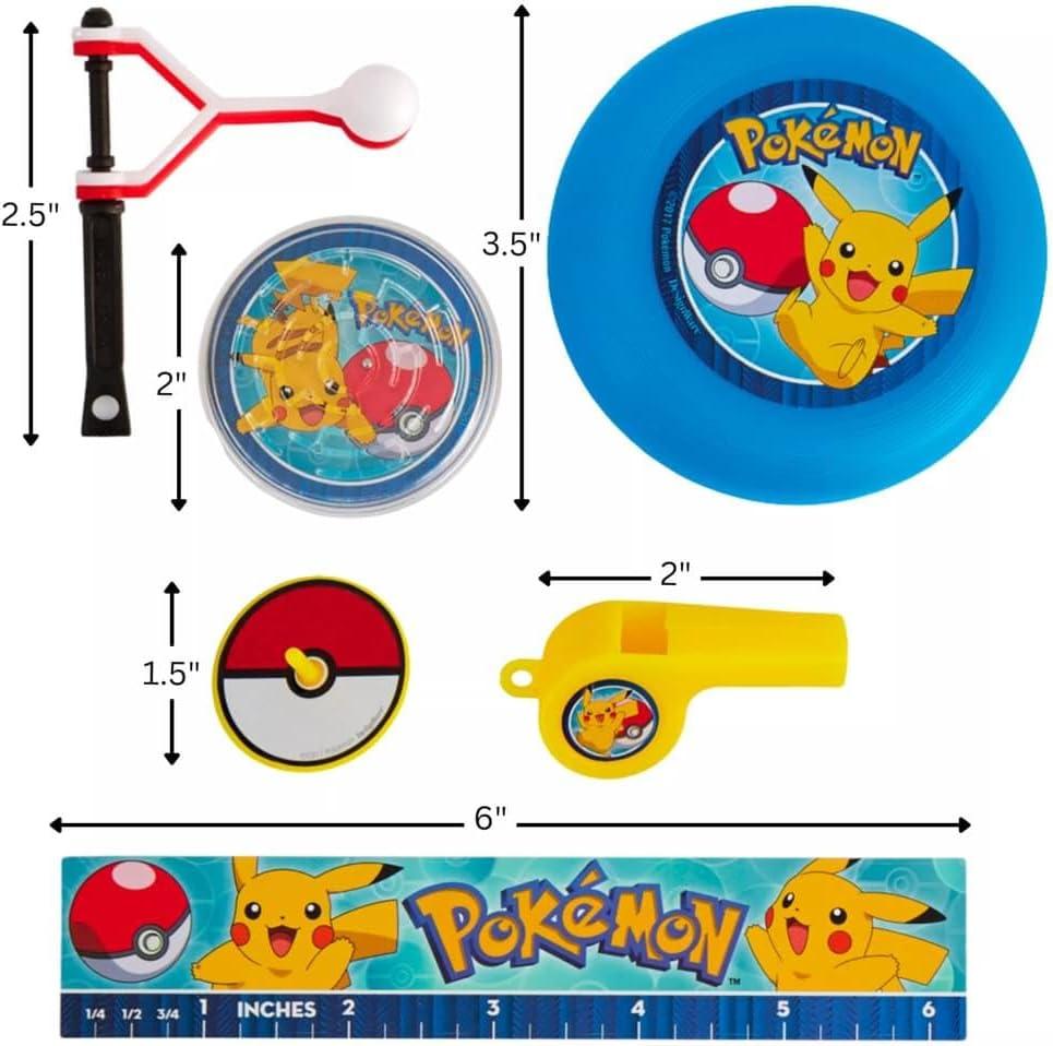 ALL-IN-ONE SET: This party favors set includes 8 flying discs, 8 maze puzzles, 8 mini clackers, 8 laser tops, 8 whistles, and 8 rulers, ensuring a fun variety of exciting activities for all the young Pokemon fans