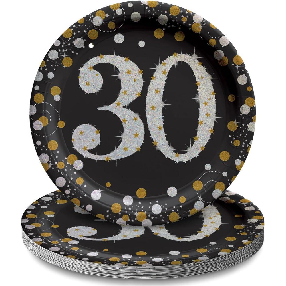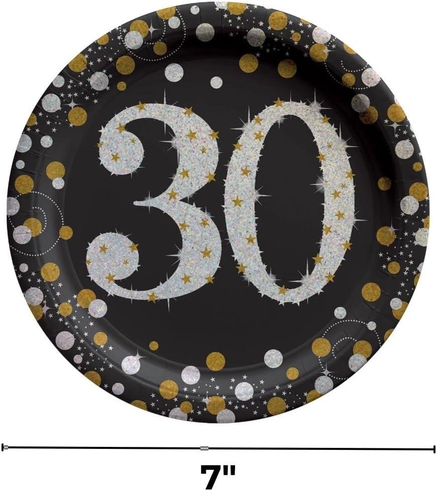 Amscan Sparkling Celebration 30th Birthday Round Prismatic Party Plates (7″) Pack of 8 – Elegant Black, Silver & Gold Tableware, Perfect for Milestone Events