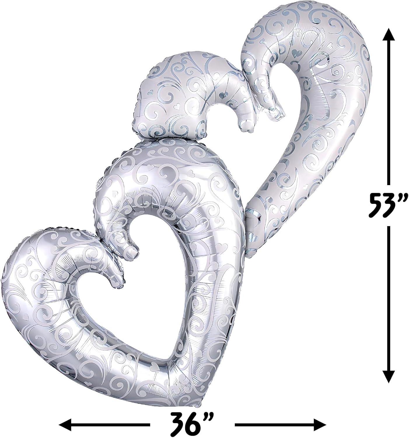 A 53″ X 36″ Silver interlocking hearts balloon with a Swirly design. Good for all occasion. Made in United States.