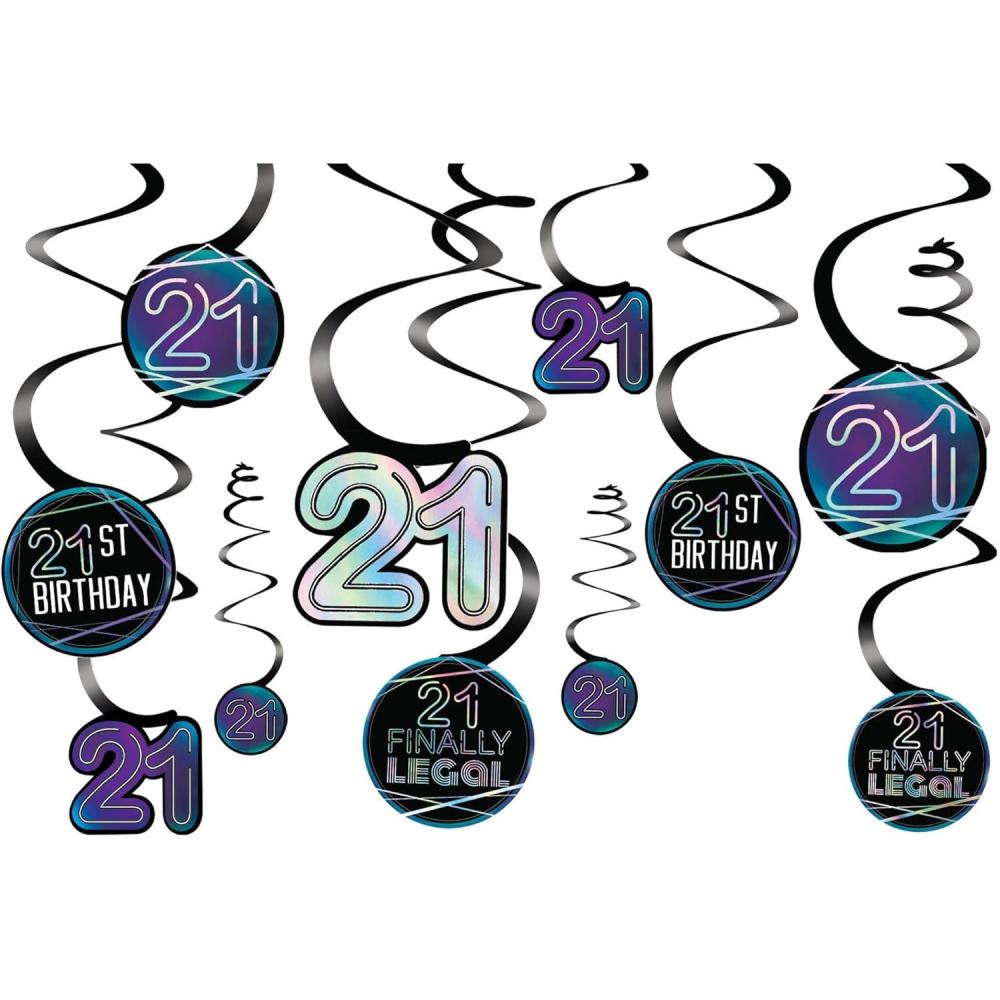 Finally 21 Spiral Decorations – Pack of 12 – Iridescent Hot-Stamped Foil Spirals with Cutouts – Perfect for 21st Birthday Celebration Decorations(Finally 21)