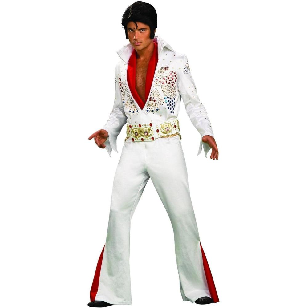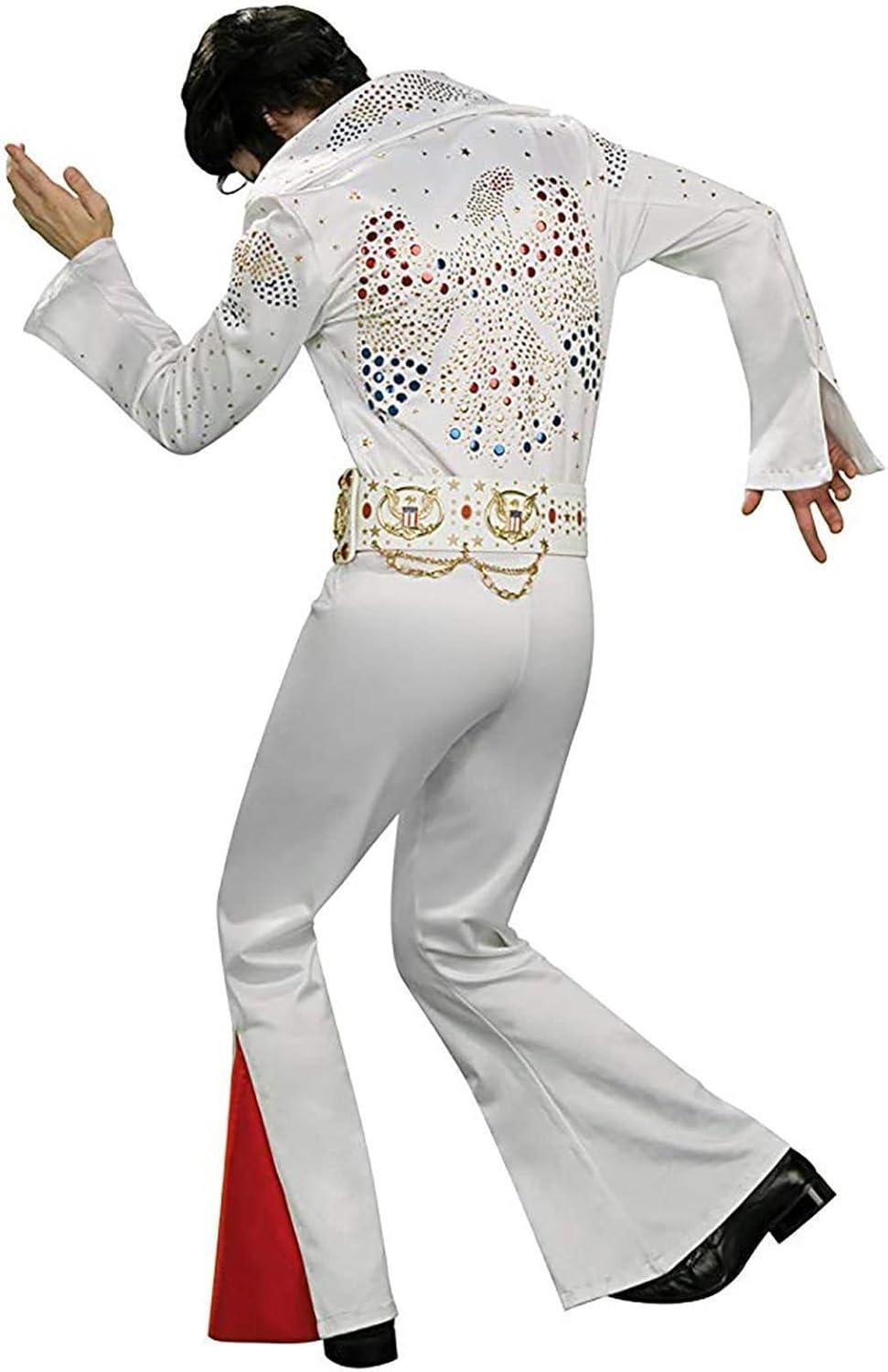 Are you an Elvis impersonator, or do you just want to pay tribute to the King? The licensed Grand Heritage Adult Elvis Costume is a replica of his Aloha Jumpsuit. It's a red and white jumpsuit with flared bell bottoms, a huge collar, and a gold belt. It's also covered in sequins and faux rhinestones. Wig, glasses, shoes, and sideburns not included. Wear this costume with pride.