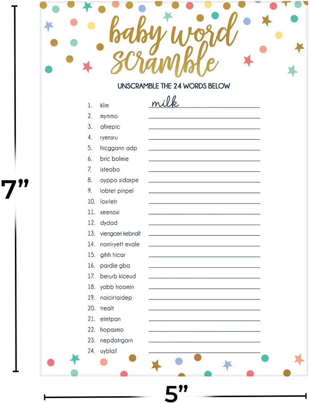 BABY SHOWER ENTERTAINMENT: Introducing the Multicolor Baby Shower 2-in-1 Word Game – the perfect blend of fun and excitement to make any gender reveal or birthday celebration unforgettable! These 5″ x 7″ cards (Pack of 24) are an amazing activity for all your guests, keeping them engaged and entertained throughout the event.