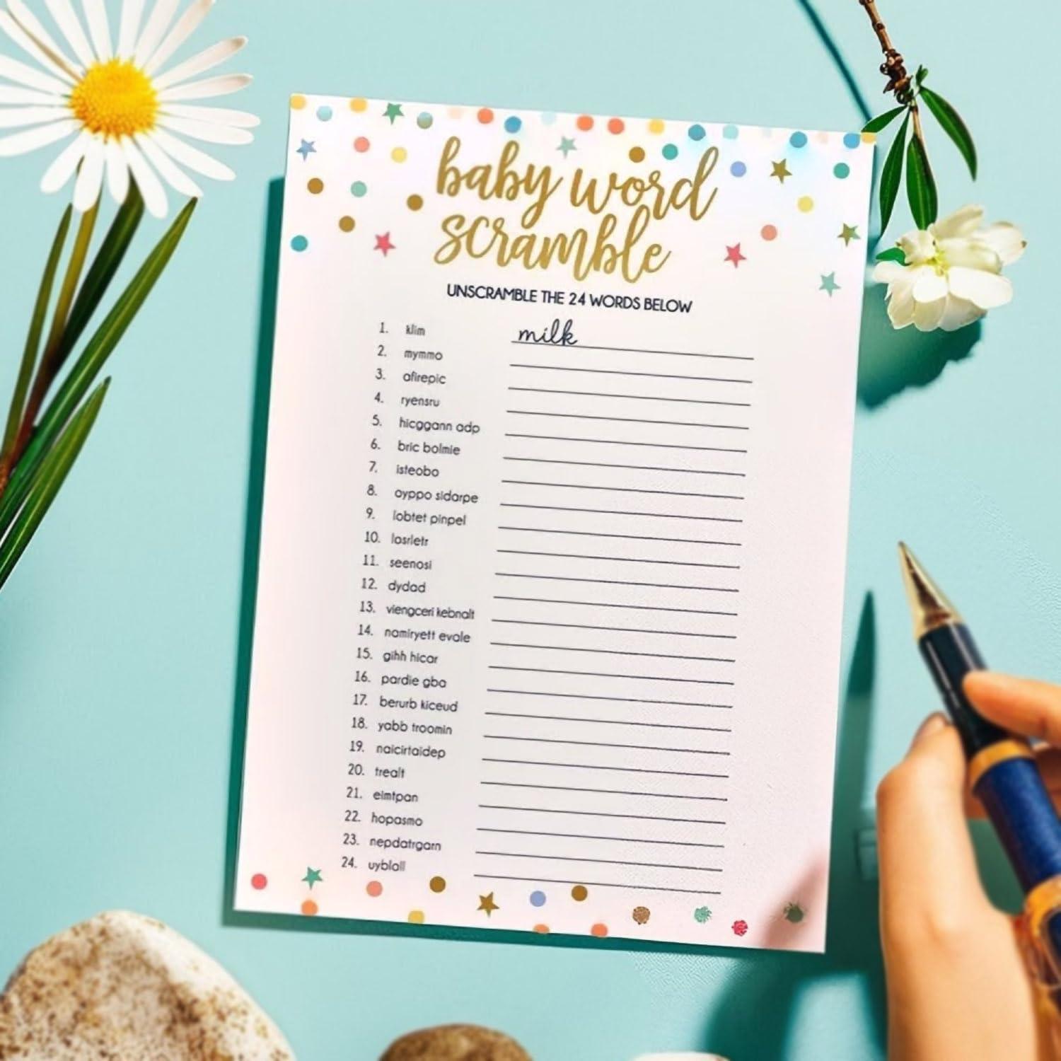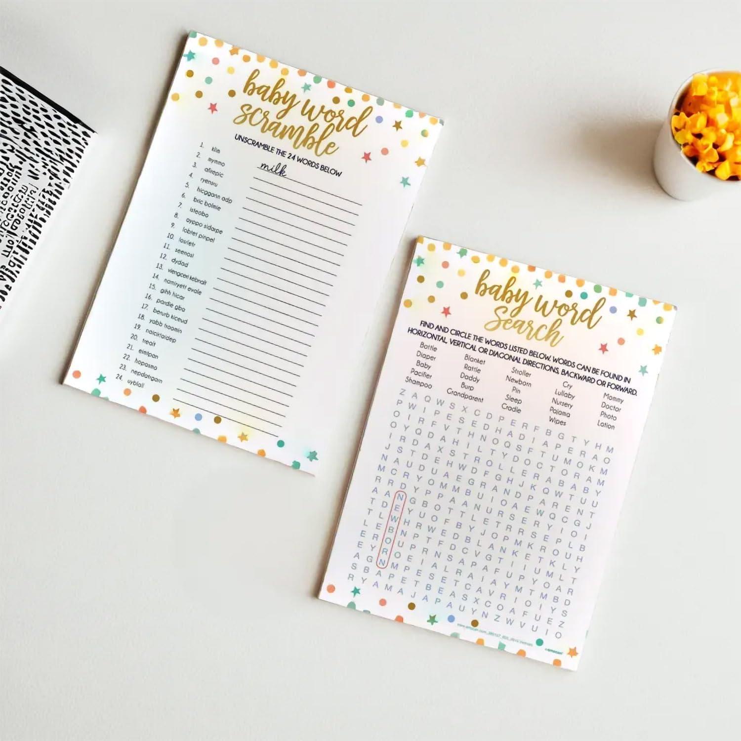 Multicolor Baby Shower 2-in-1 Word Game – 5″ x 7″ (Pack of 24) – Premium Paper Fun Activities for Gender Reveals and Birthdays