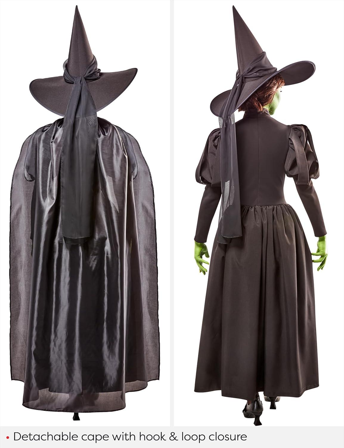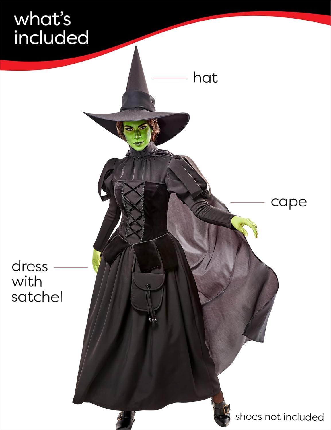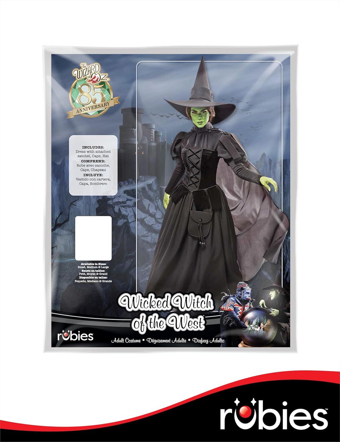 Cast a spell of classic movie magic with the officially licensed Wicked Witch Costume by Rubies! Inspired by the unforgettable Wicked Witch of the West from The Wizard of Oz, this costume features a dramatic black dress with attached cape, a matching satchel, and the iconic pointed witch hat. Perfect for Halloween, costume parties, theatrical performances, or Wizard of Oz-themed events, this look brings the legendary villainess to life with style and flair. Whether you're cackling through the night or flying off to steal those ruby slippers, this wickedly fun costume ensures you’ll make a haunting impression. Embrace your inner villain and become the most iconic witch ever to grace the Yellow Brick Road!